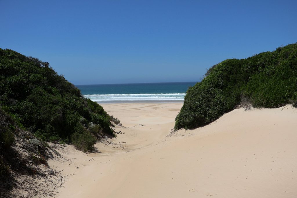 Heute haben wir den Tsitsikamma Nationalpark verlassen. Ziel war es, um spätestens 14:30 Uhr bei Schotia Safaris zu sein. Dieses Game Reserve liegt knapp 50 Kilometer von Port Elisabeth entfernt. Am Weg dort hin, haben wir uns überlegt, ob wir noch Sandboarden gehen sollen in Jeffrey’s Bay. Nachdem der Typ aber irgendwie nicht vor Ort war, haben wir es gelassen und sind stattdessen kurz in den Ort gefahren. Außer ein paar Surfern am Meer zuzusehen, hat sich dort aber nicht viel getan. Somit haben wir stattdessen einen Zwischenstopp im Kabeljous Nature Reserve gemacht und sind vom dortigen Parkplatz aus bis zum Meer und zu den wunderschönen Sanddünen gegangen. 18 Grad hat der Indische Ozean gerade einmal. Zum Füße baden hat’s gereicht 😅